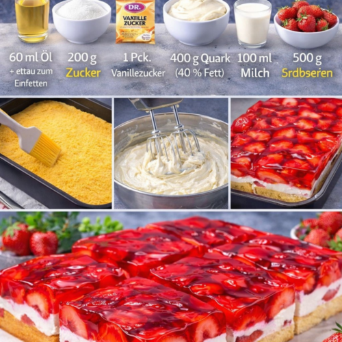 Dieser ultimative Erdbeerkuchen ist ein wahrer Genuss – saftig, fruchtig und so zart, dass er auf der Zunge zergeht! Der lockere Quark-Öl-Teig bildet die perfekte Basis für frische, saftige Erdbeeren, die mit einem glänzenden roten Tortenguss überzogen werden. Einfach zuzubereiten und ein echter Hingucker auf jeder Kaffeetafel!